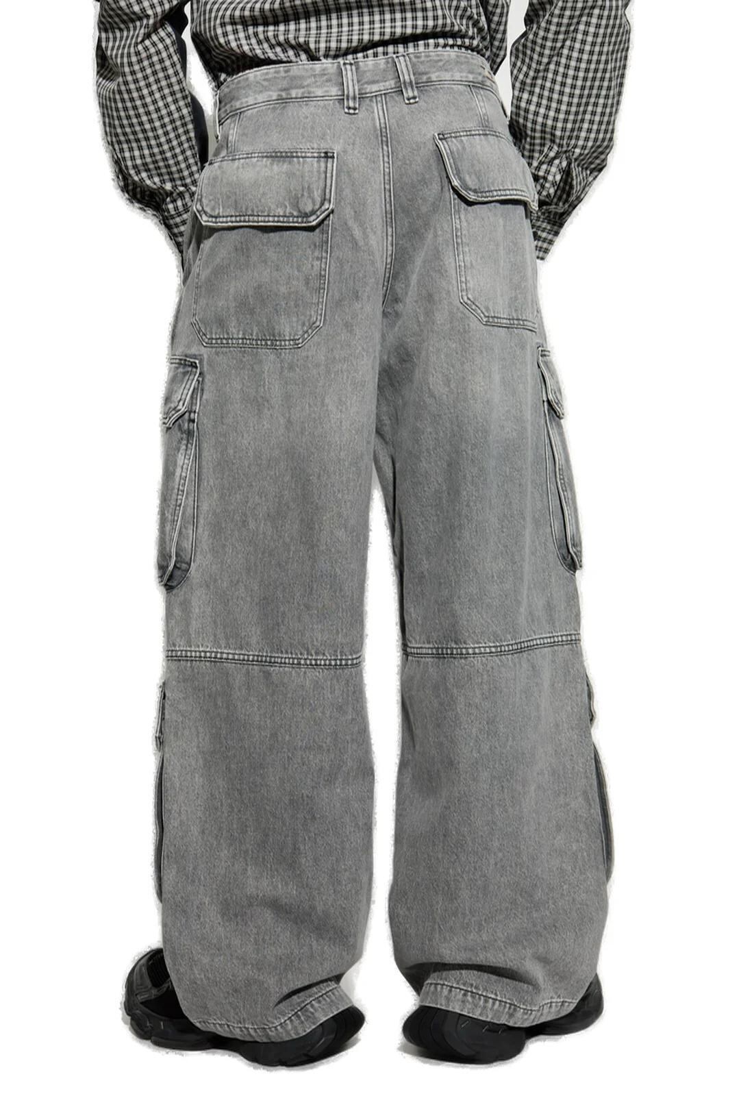 ミドルライズ、レギュラー丈のカットにボタンとジッパー開閉のジーンズ。オーバーサイズのシルエットと大きなカーゴポケットを組み合わせ、機能的でありながらリラックスしたストリートウェア風のルックスを実現しています。モノクロ仕上げとさりげない金具のアクセントが、デイリーユースにぴったりの魅力を高めています。