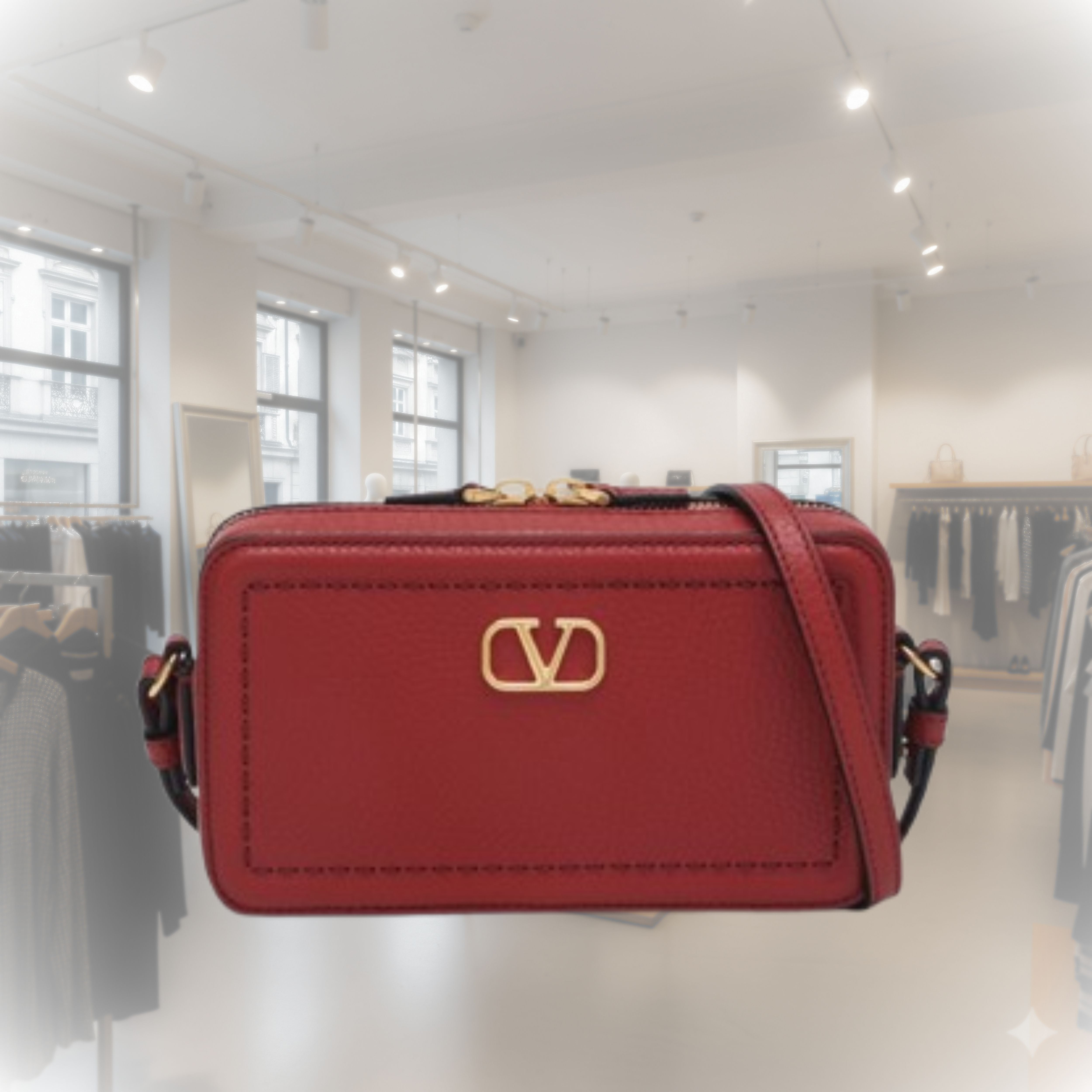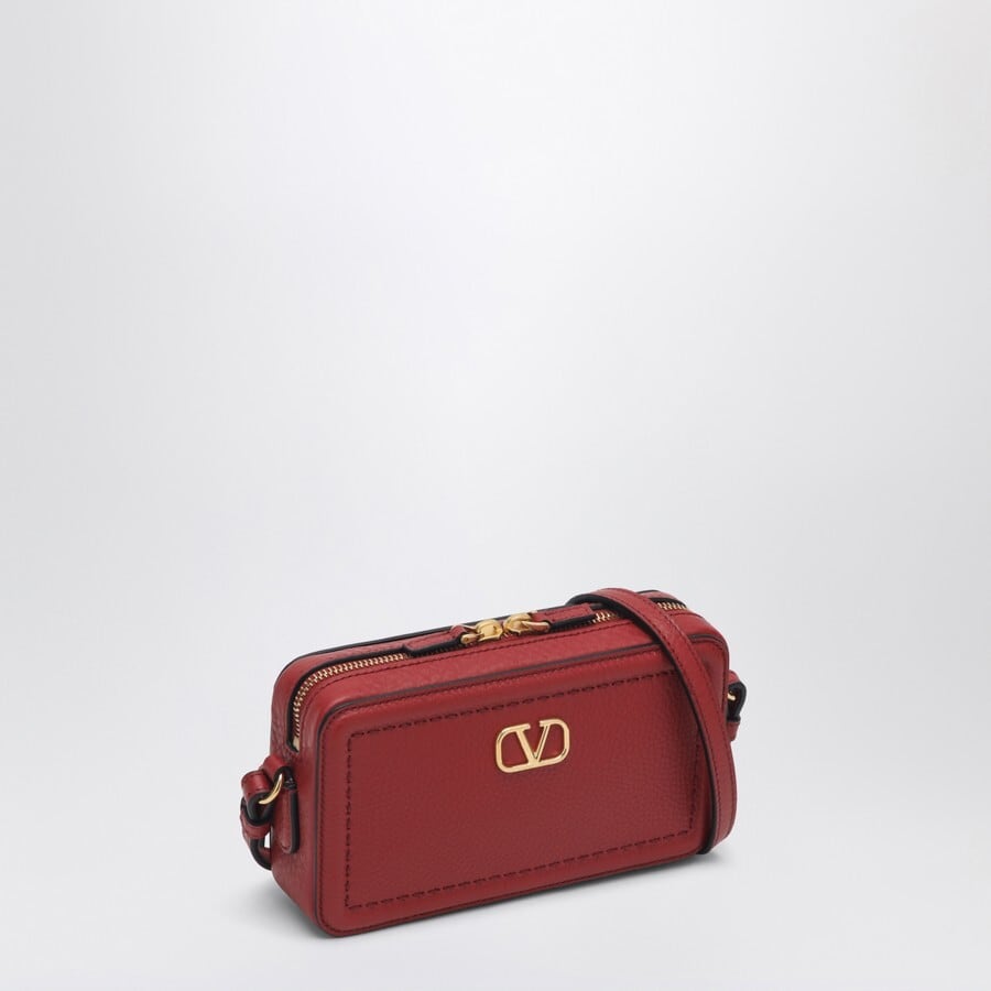 Valentino Garavaniのレッドグレインカーフスキンレザーのスモールショルダーバッグで、調節可能なショルダーストラップ、フロントにゴールド仕上げのVlogoシグネチャーメタルプレート、ジップ開閉、内側のフラットポケットが特徴です。