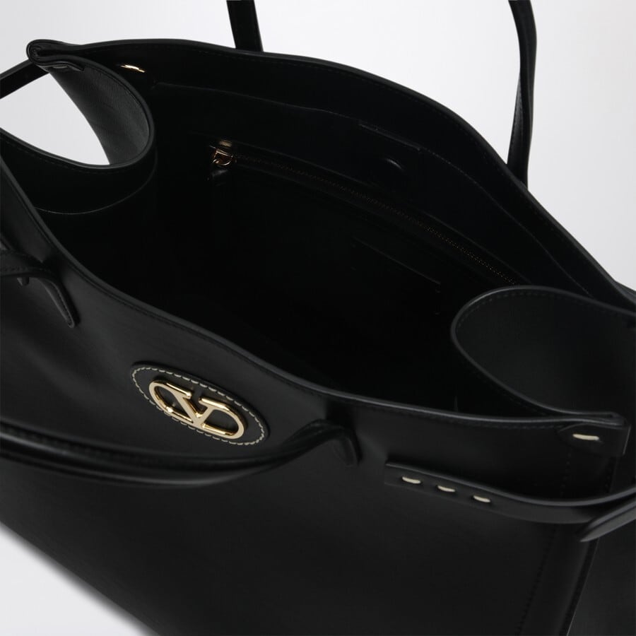 Valentino Garavani ミディアム トートバッグ ブラック レザー、2 つのレザー ハンドル、調節可能で取り外し可能なショルダー ストラップ、サイド バックル、ゴールド仕上げのメタル Vlog シグネチャー プレート、マグネット クロージャー、ジッパー付き内側のフラット ポケットを備えたレザー パッチが特徴です。