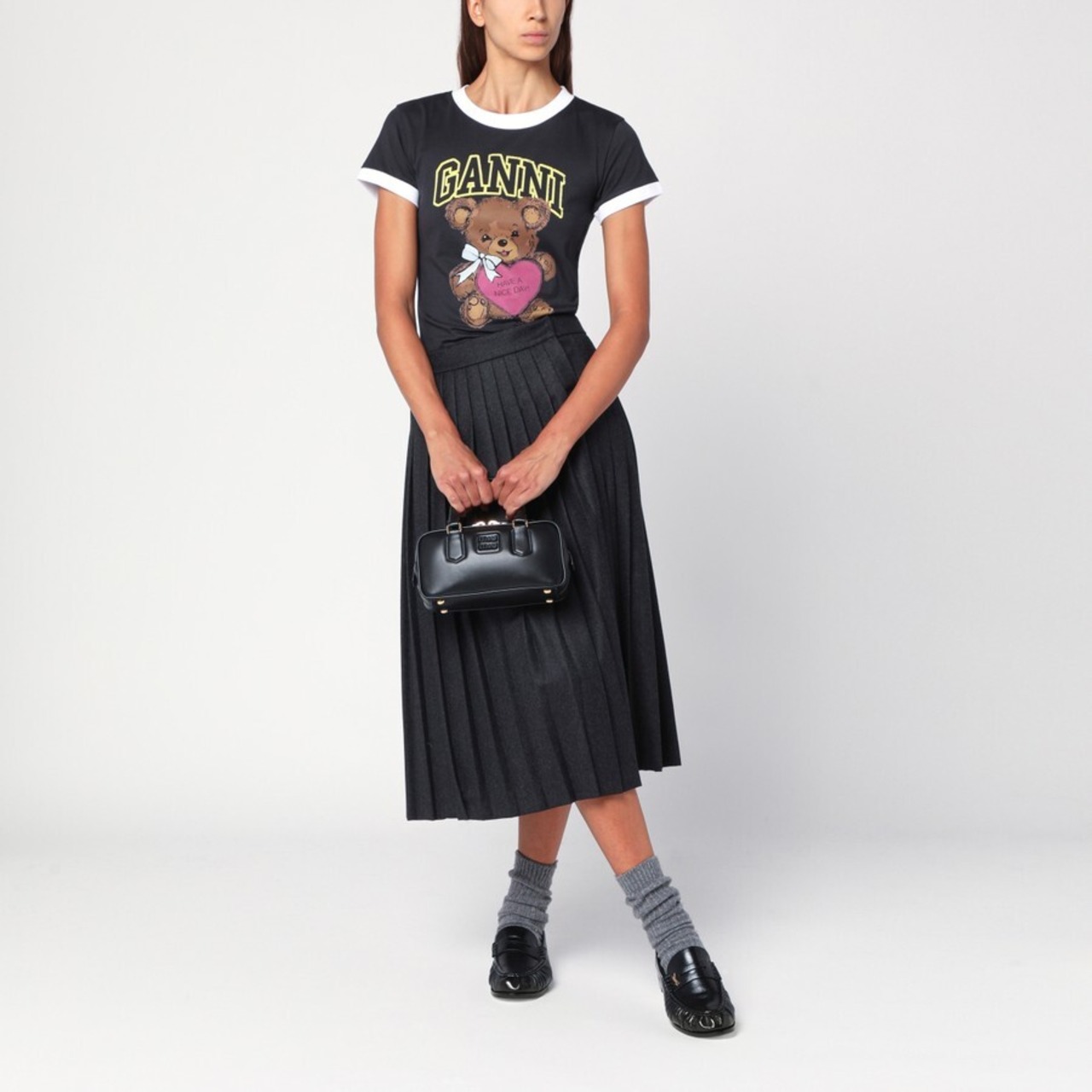 GanniのダークグレーのオーガニックコットンクルーネックTシャツは、ホワイトエッジ、半袖、フロントにテディベアとロゴのレタリングをあしらったプリントが特徴です。