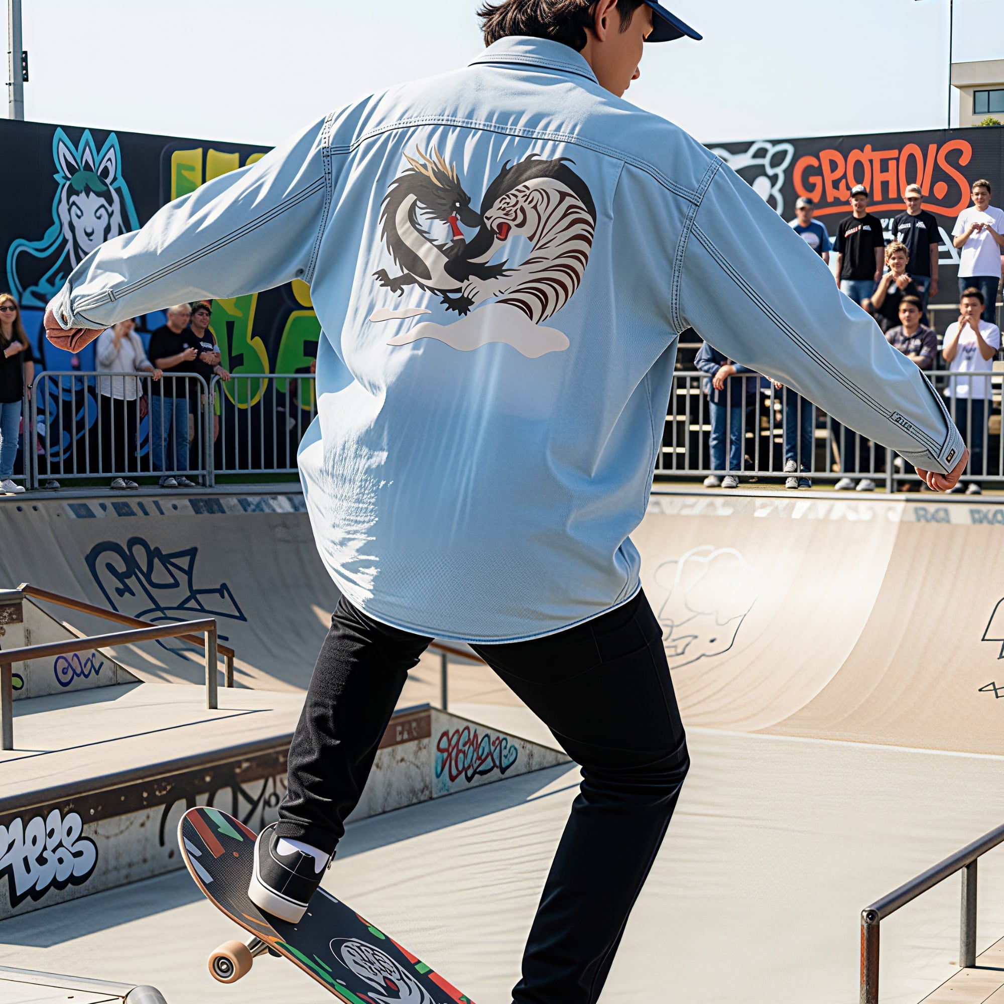 黒い龍と白虎を描いた刺繍デニムジャケットです。