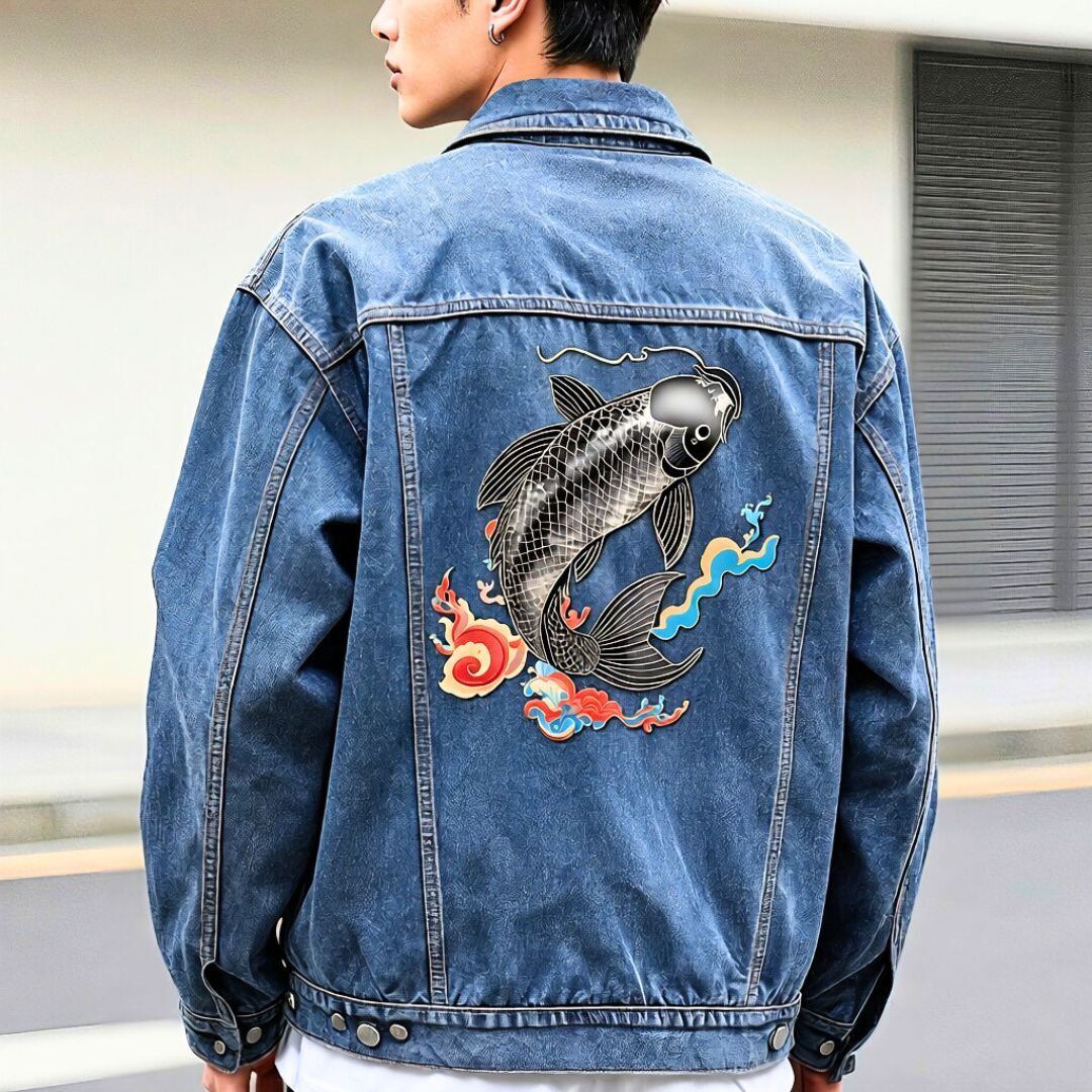 日本画 銀鯉 刺繍 デニムジャケット|日本製刺繍 一点もの わびさび 和風アートジャケット 送料無料