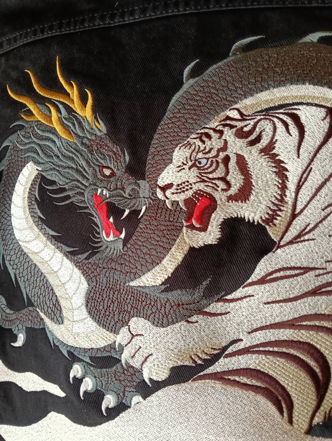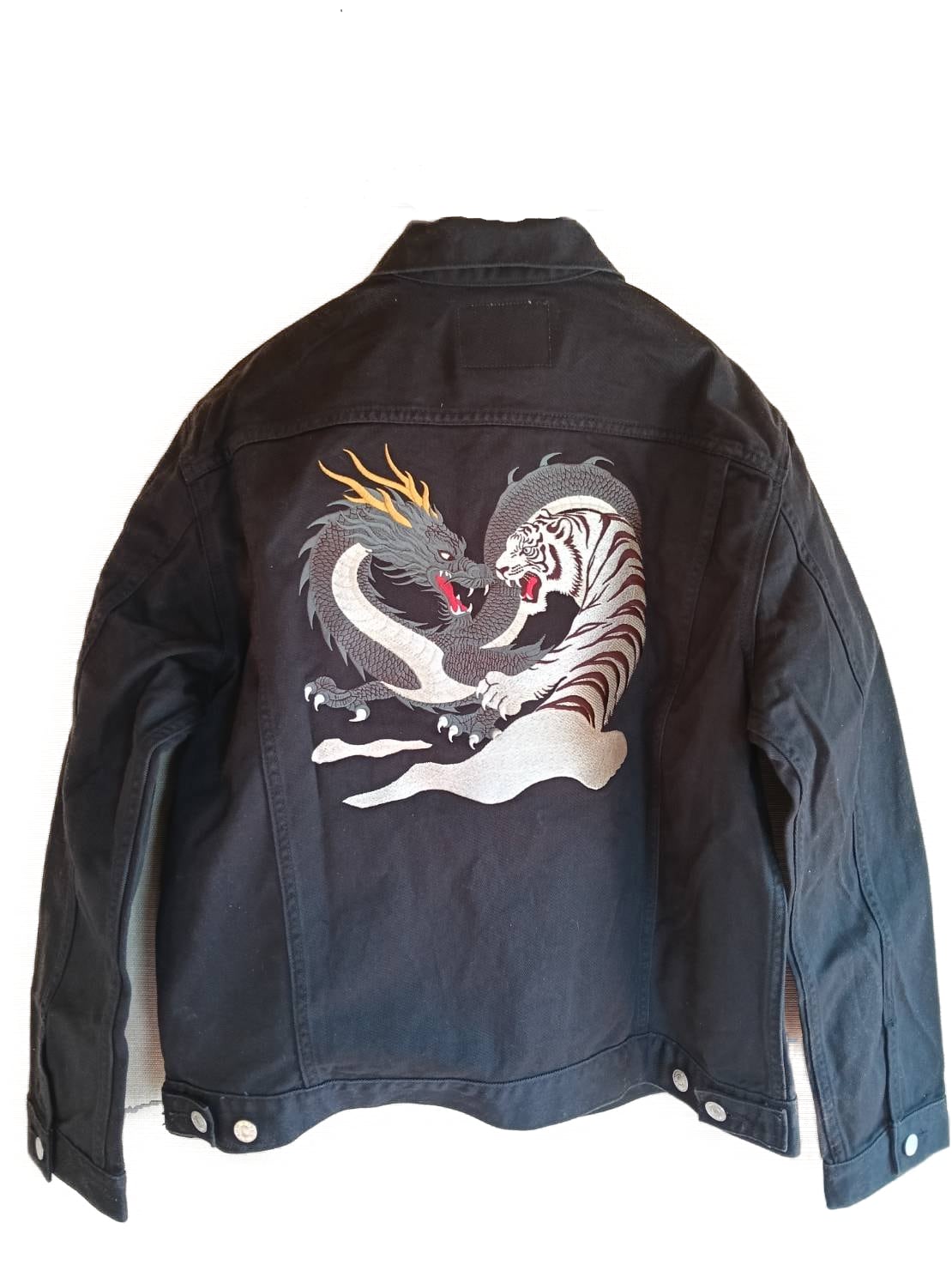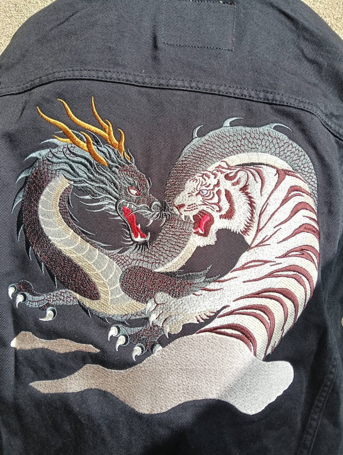 黒い龍と白虎を描いた刺繍デニムジャケットです。