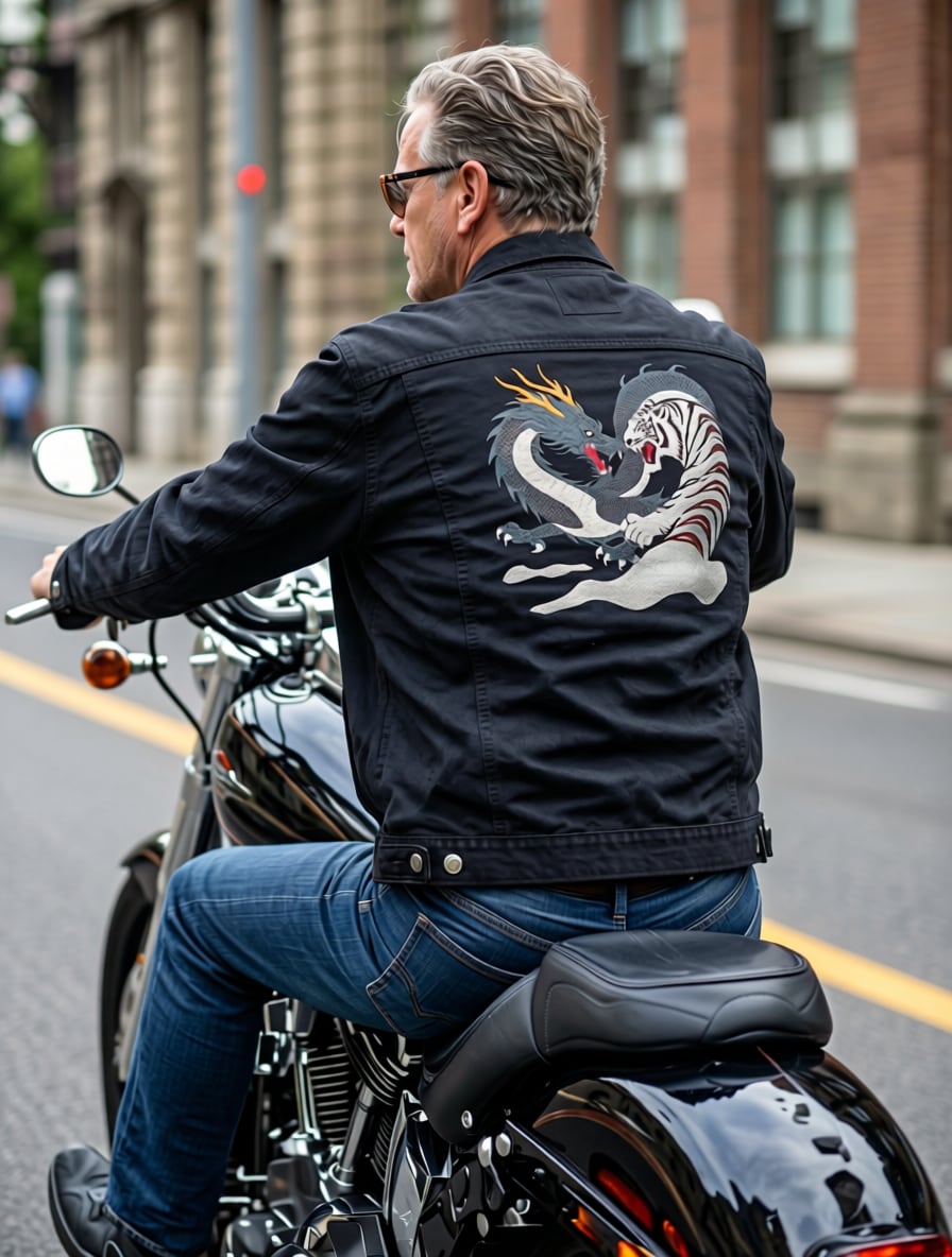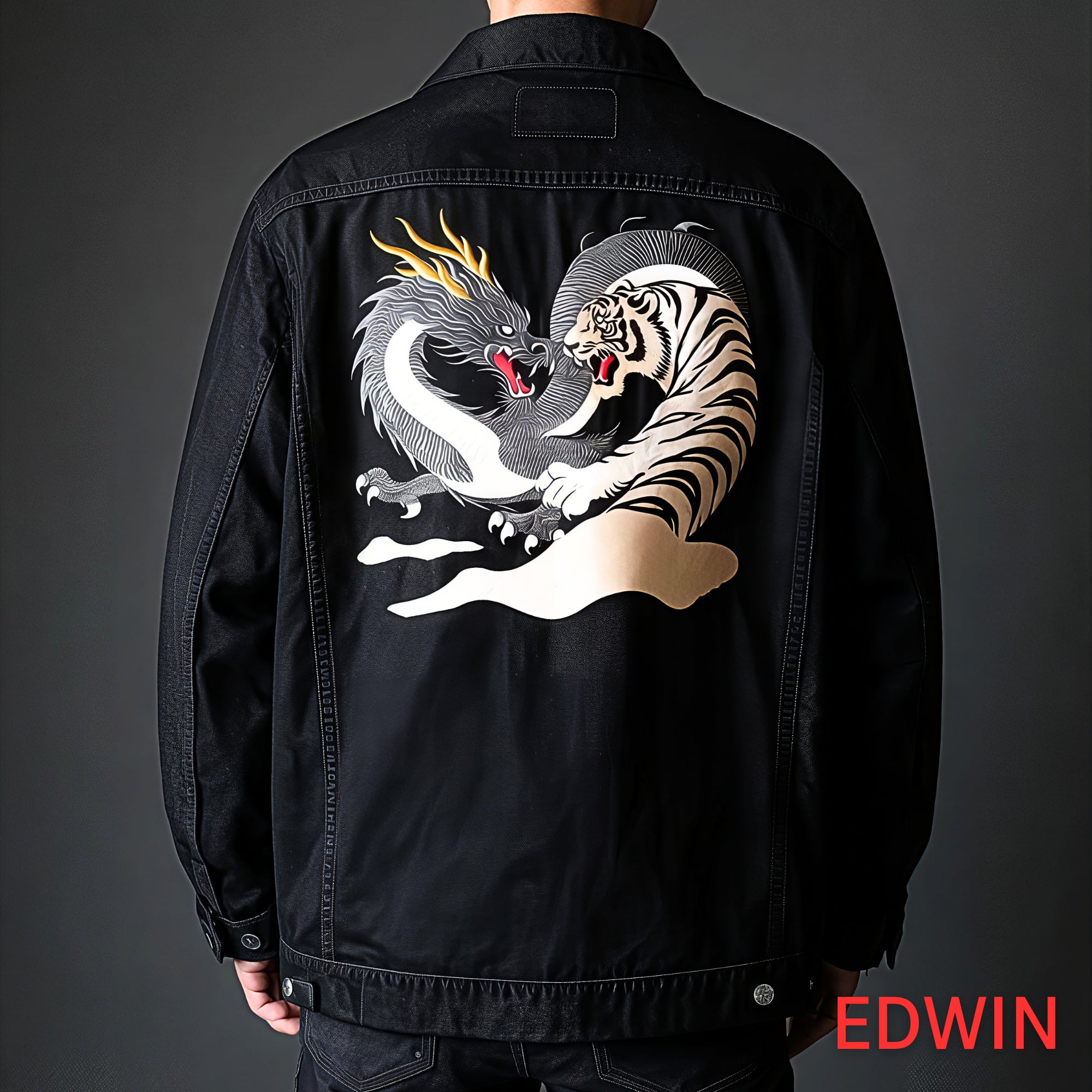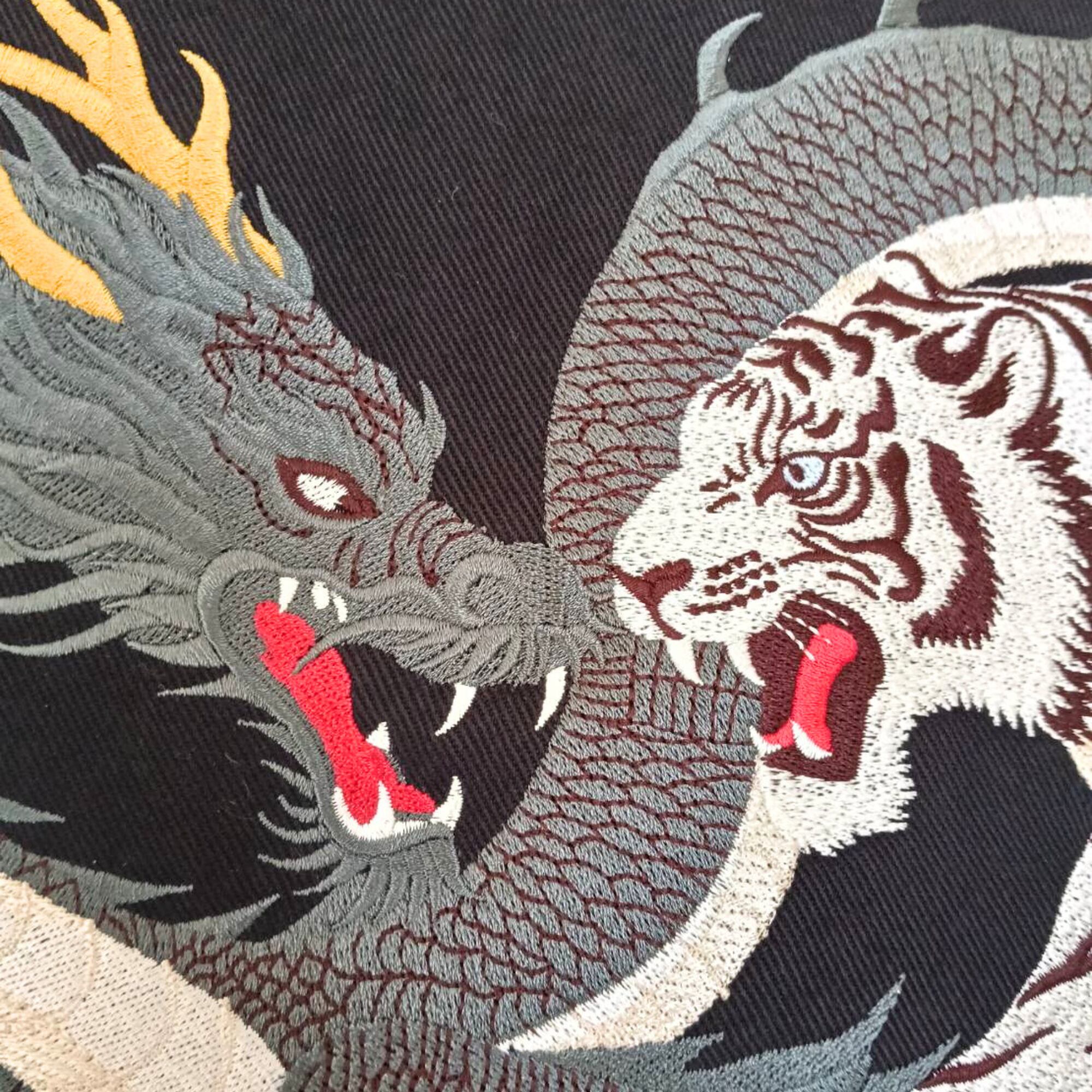 黒い龍と白虎を描いた刺繍デニムジャケットです。